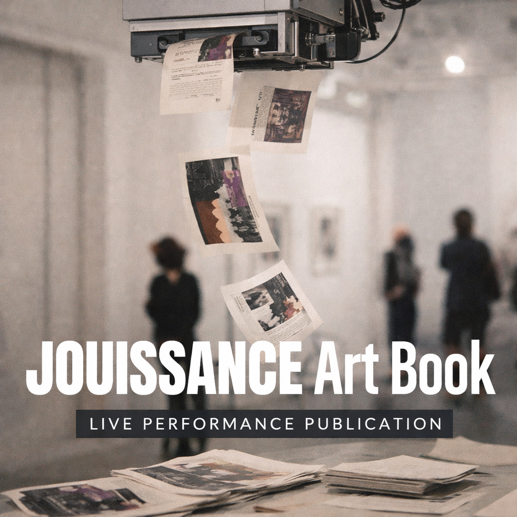 The Jouissance Art Book is presented as a live, unfolding performance. Pages are printed from the ceiling and released gradually into the gallery, accumulating over time. Rather than encountering a finished publication, visitors receive the work in fragments, one page at a time. The art book features original and scanned works by Abigail Hendrix, Alice Shapiro, Annis Joslin, Carmen Gray, Clare Archibald, Dana Teen Lomax, Jennifer Helminski, Kevin Chen, Mandy Eugeniou, Maya Ivona Peiu, Michael Betancourt, Ryan Hooper, Sermon Jeff, Sybil Xyshen, Trish, Wendy Oberlander, Yates, Zach Hammer, and Zoey Solomon.